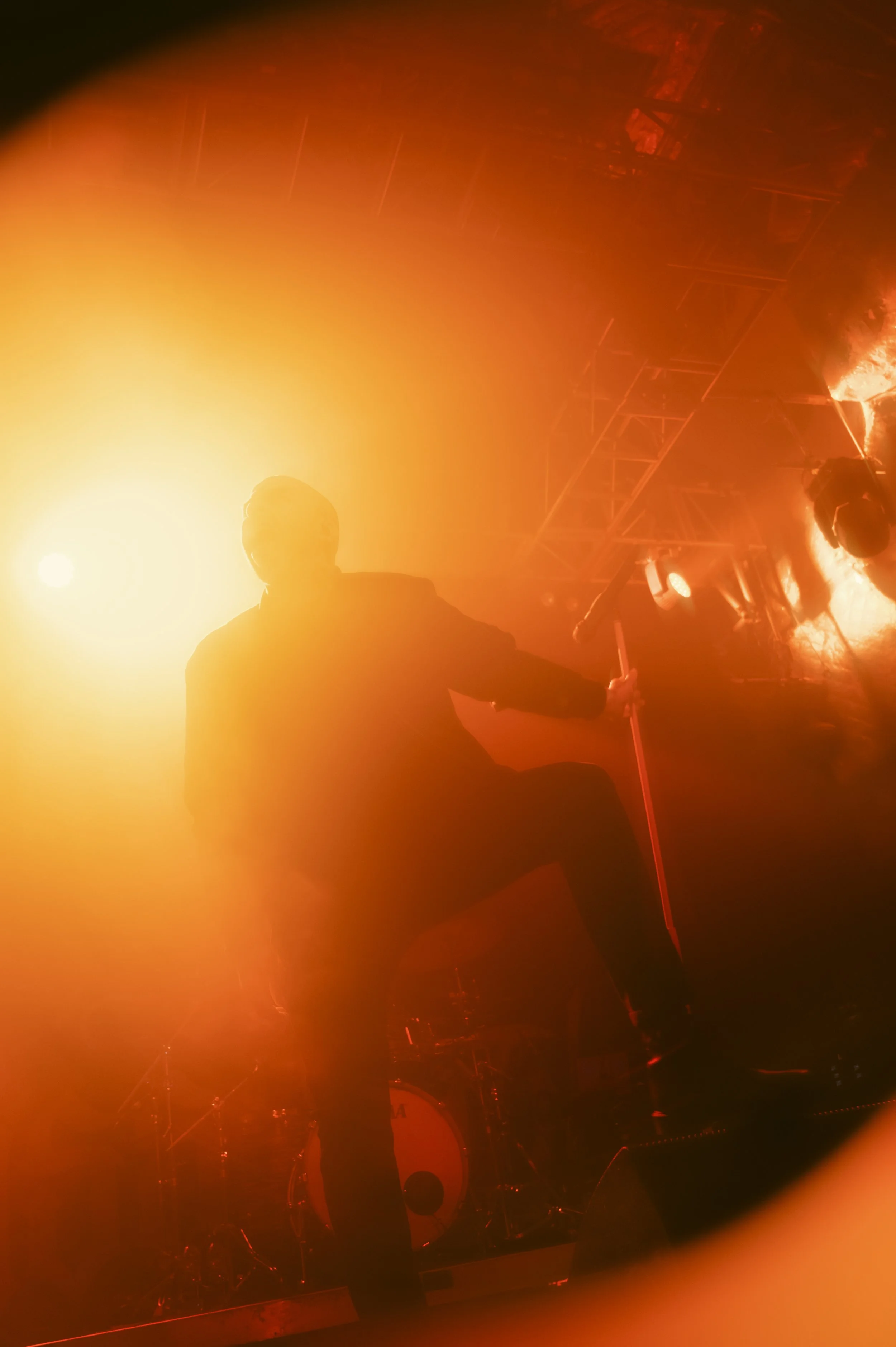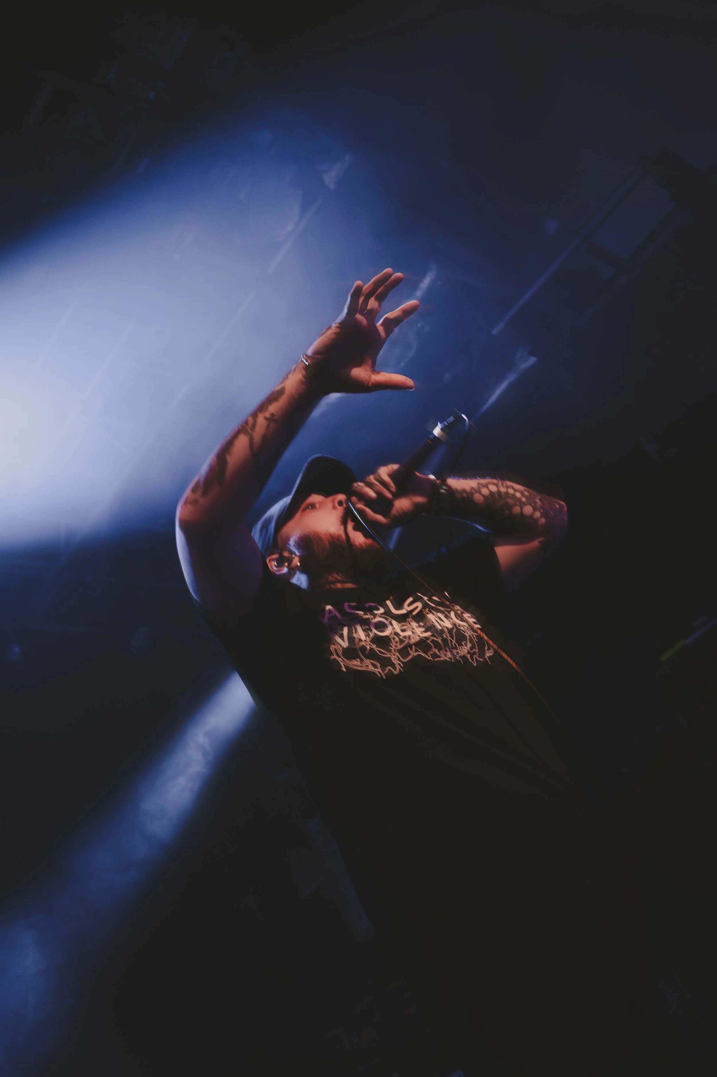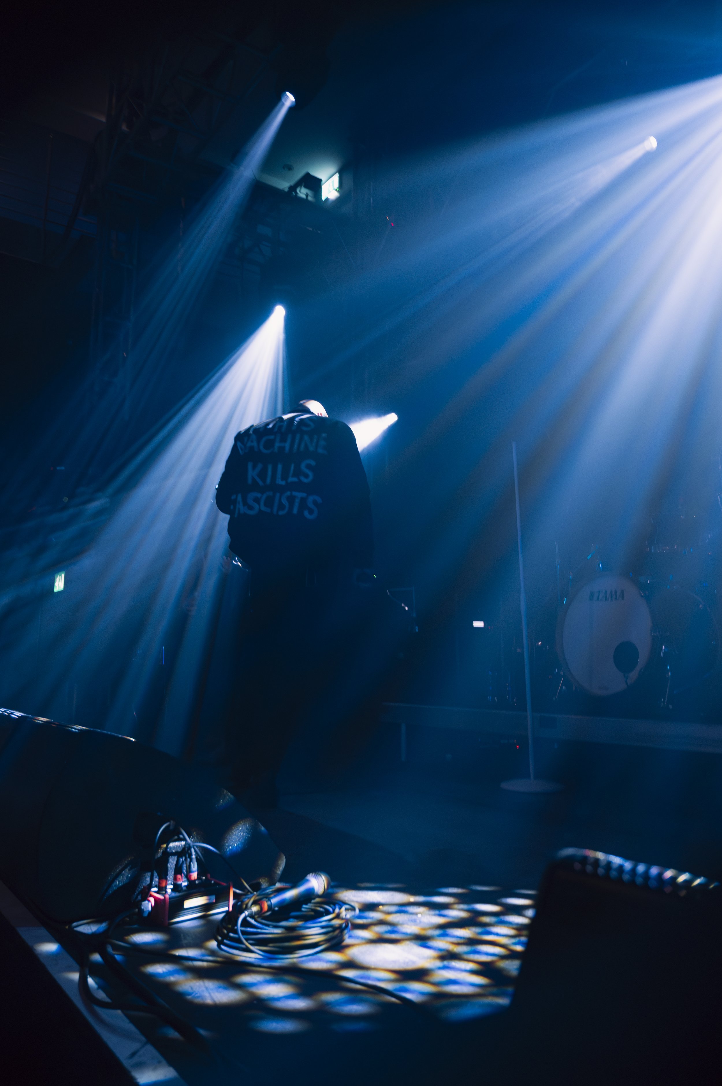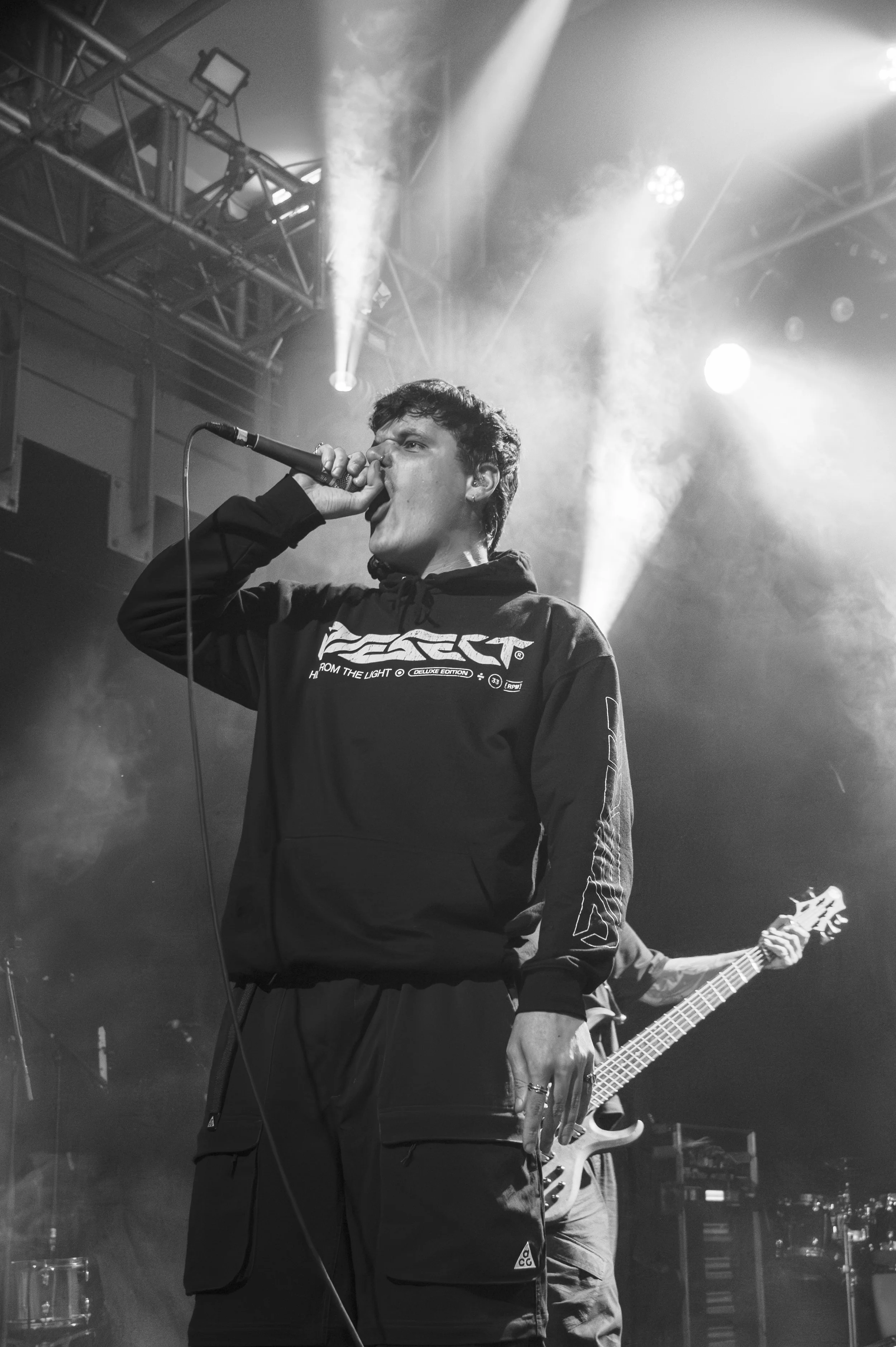 Next up were Great American Ghost. Vocalist Ethan Harrison stepped forward, his jacket reading “This machine kills fascists” a nod to American singer-songwriter Woody Guthrie, and immediately unleashed chaos. Ethan kept the fans fully engaged, joking, “I’m not going to tell you what not to do” as he encouraged crowd surfing. He stayed right in the thick of the action, helping security lift crowd surfers and even joining the action himself.