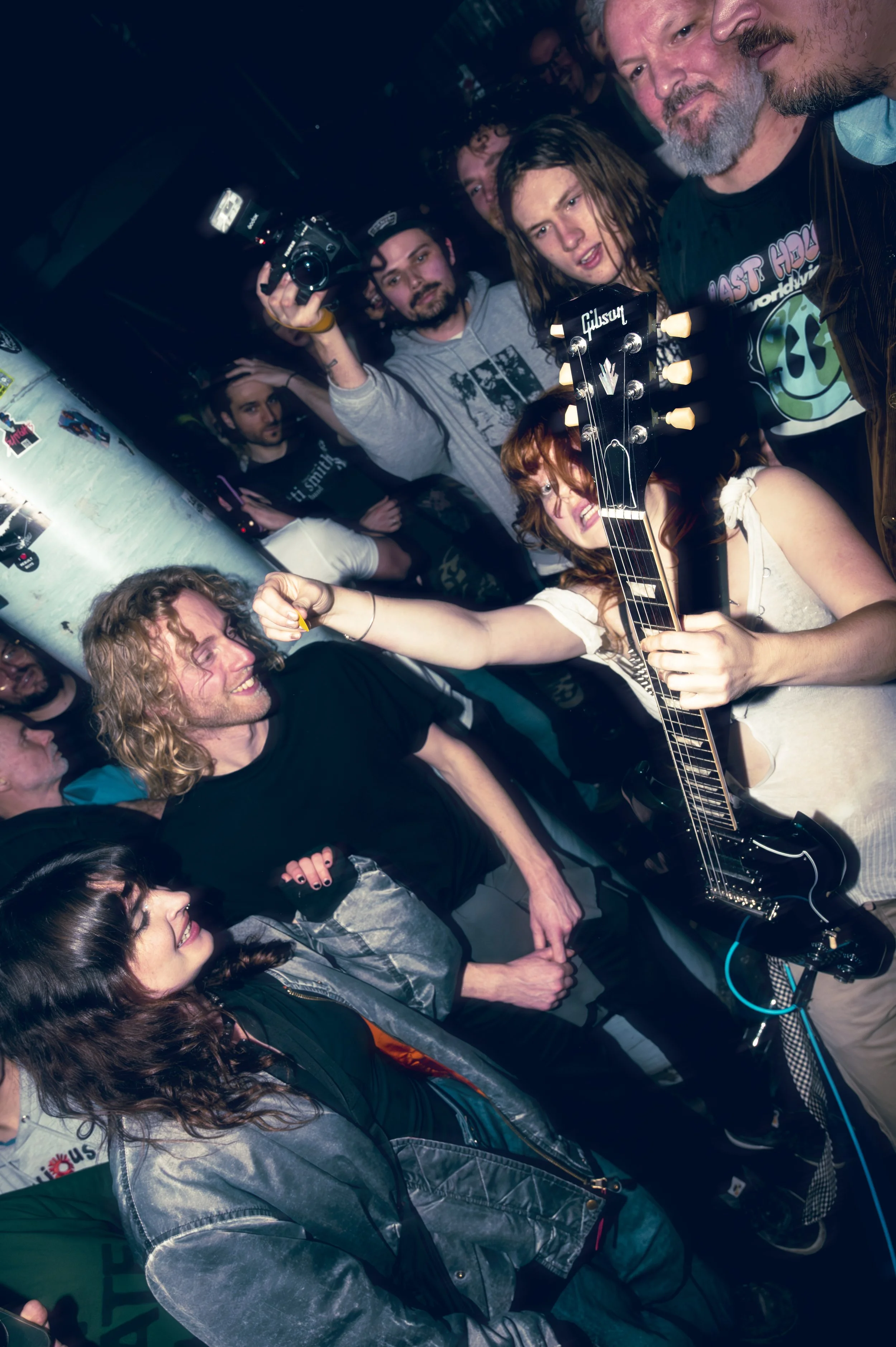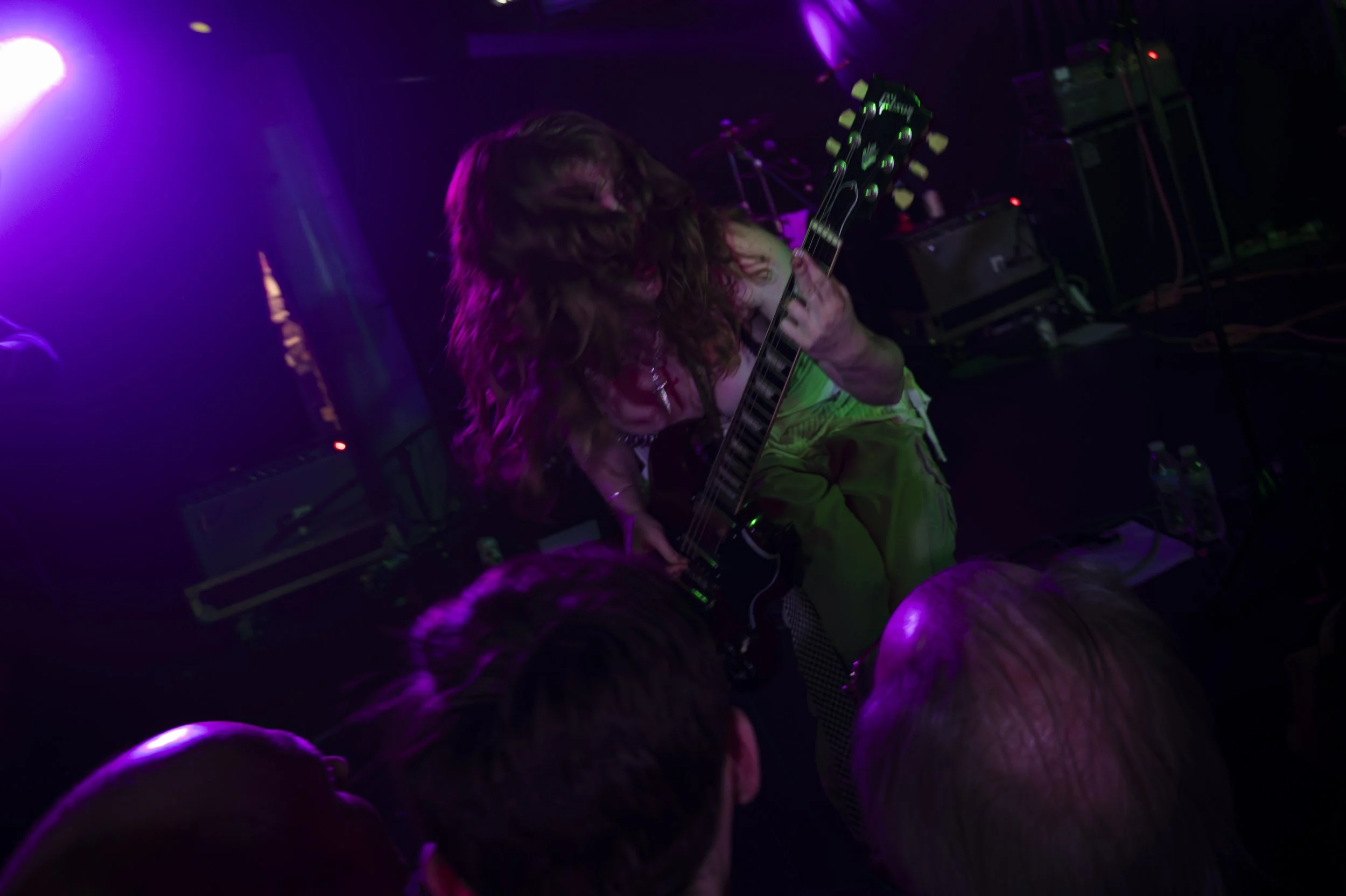 We caught Die Spitz in London at The Underworld, Camden’s legendary live venue. The sold-out Tuesday night show was rammed — bodies pressed against the stage, sweat in the air. Soon, band members were crowd-surfing across waves of people. Aerial Salad kicked things off with a fiery, high-energy set, priming the crowd perfectly for Die Spitz’s onslaught.