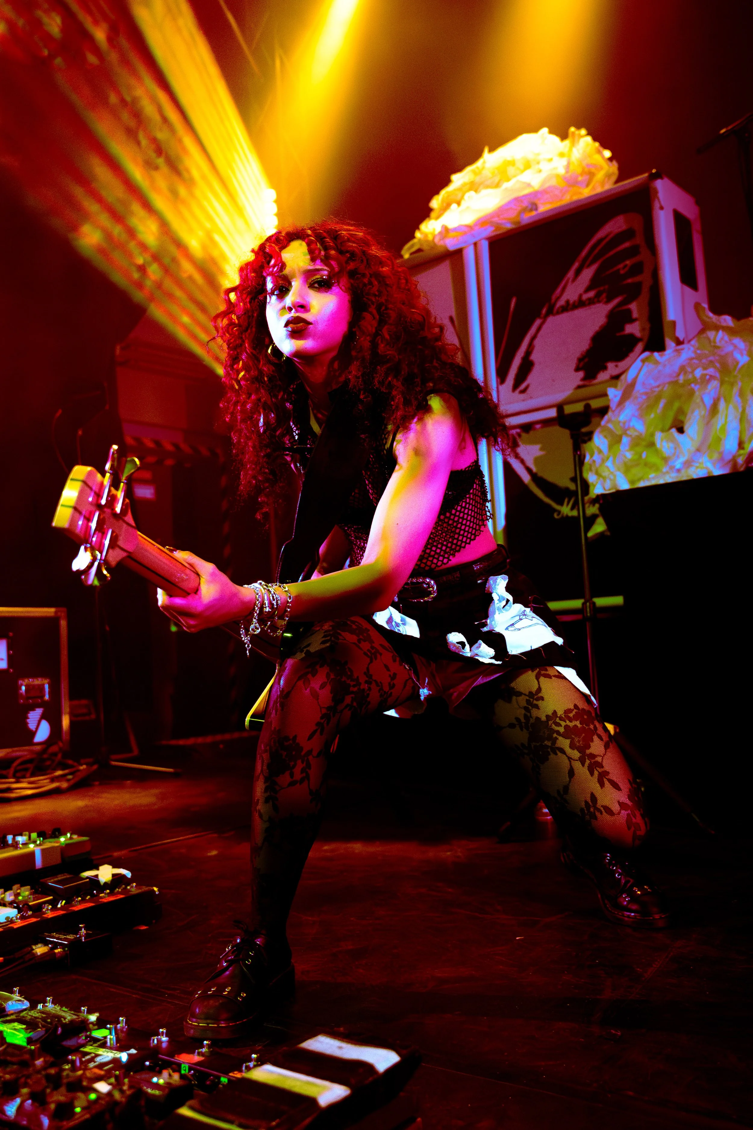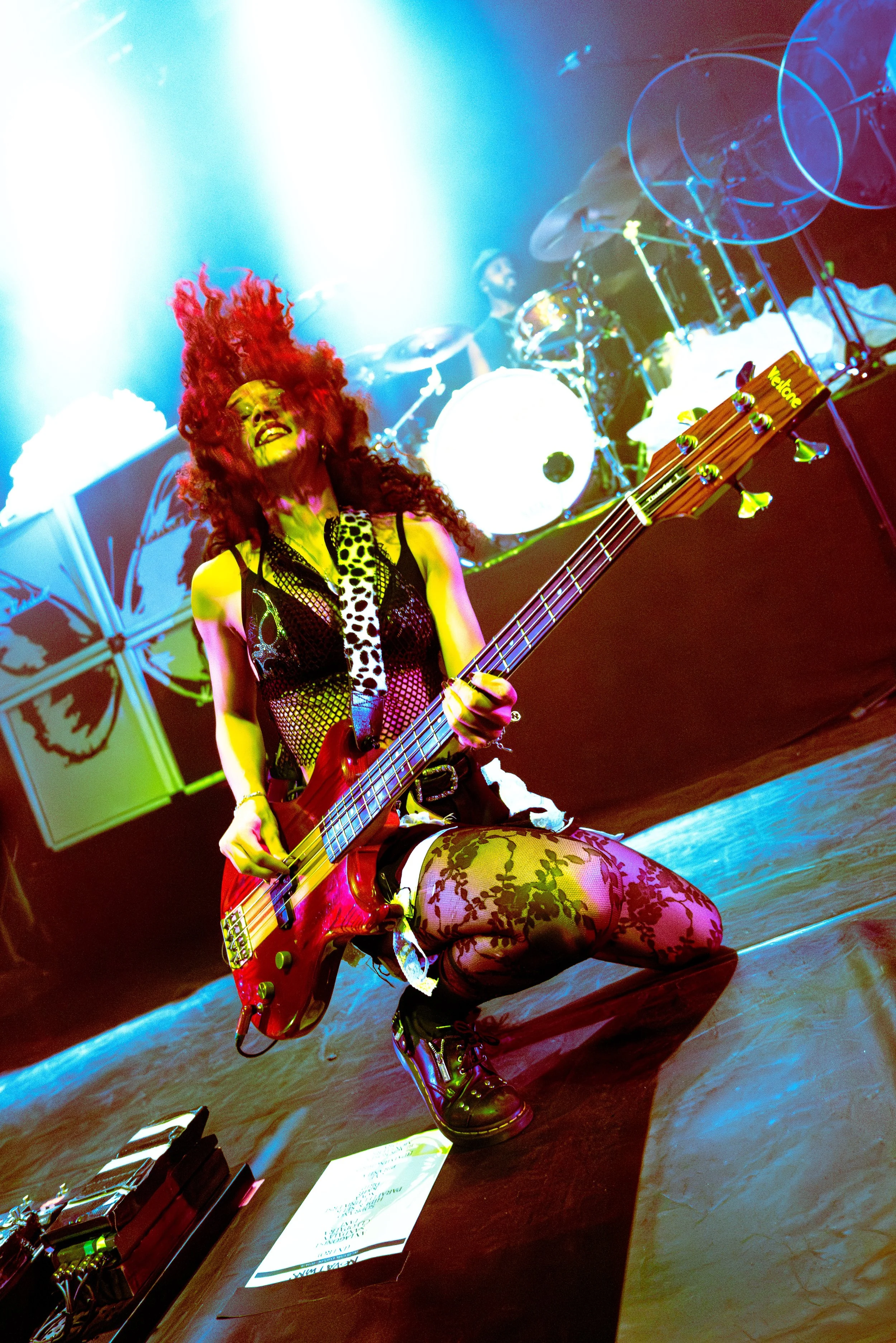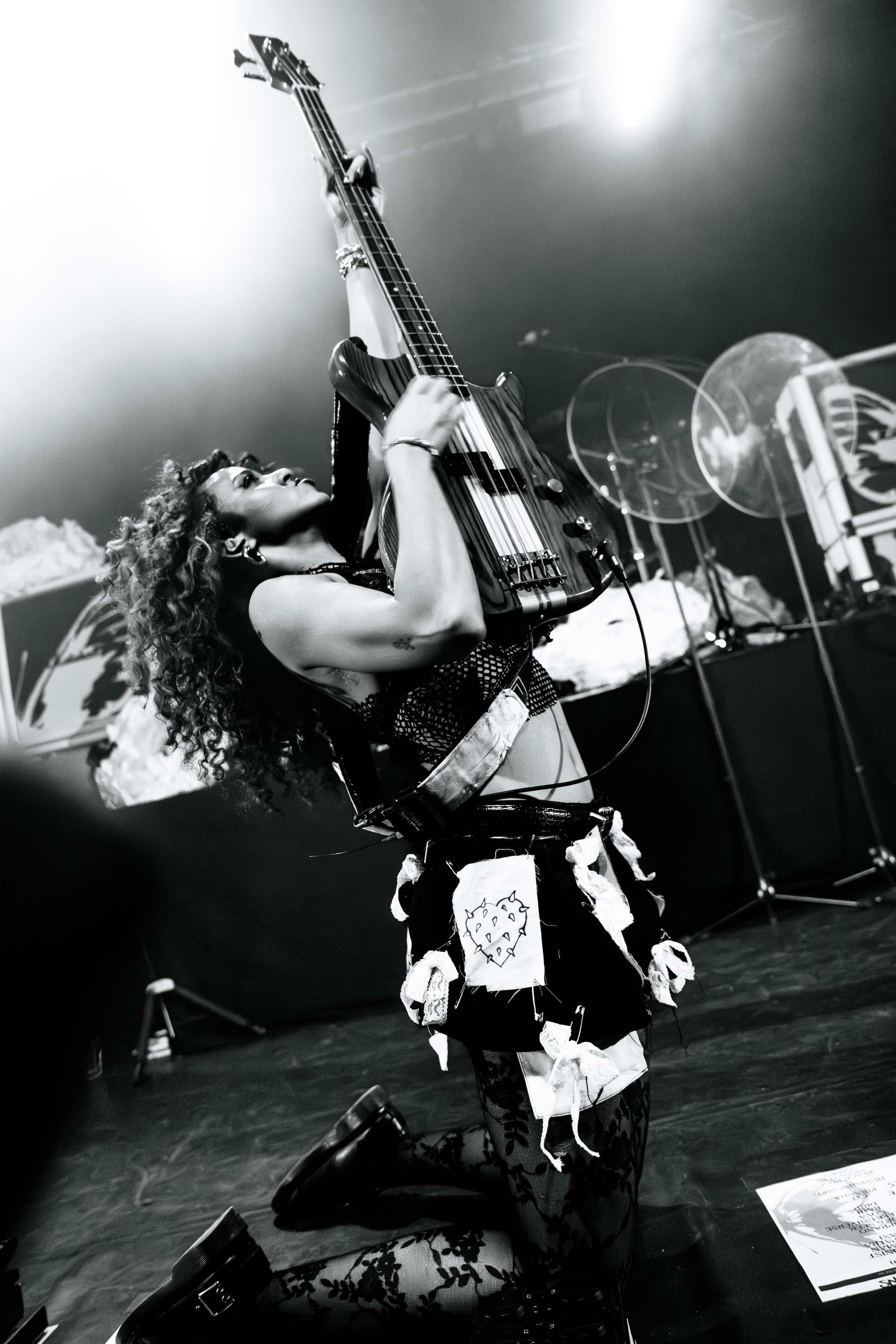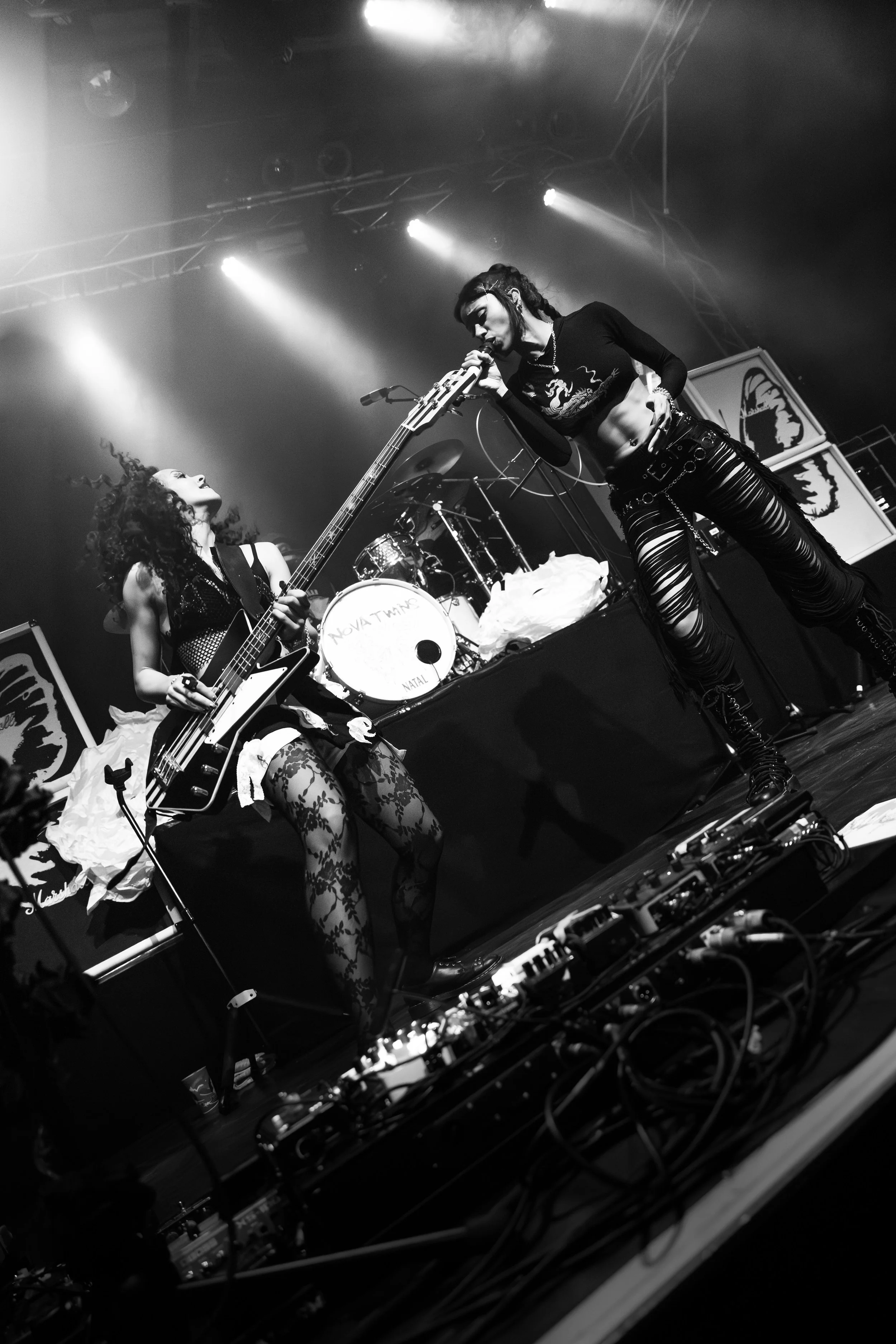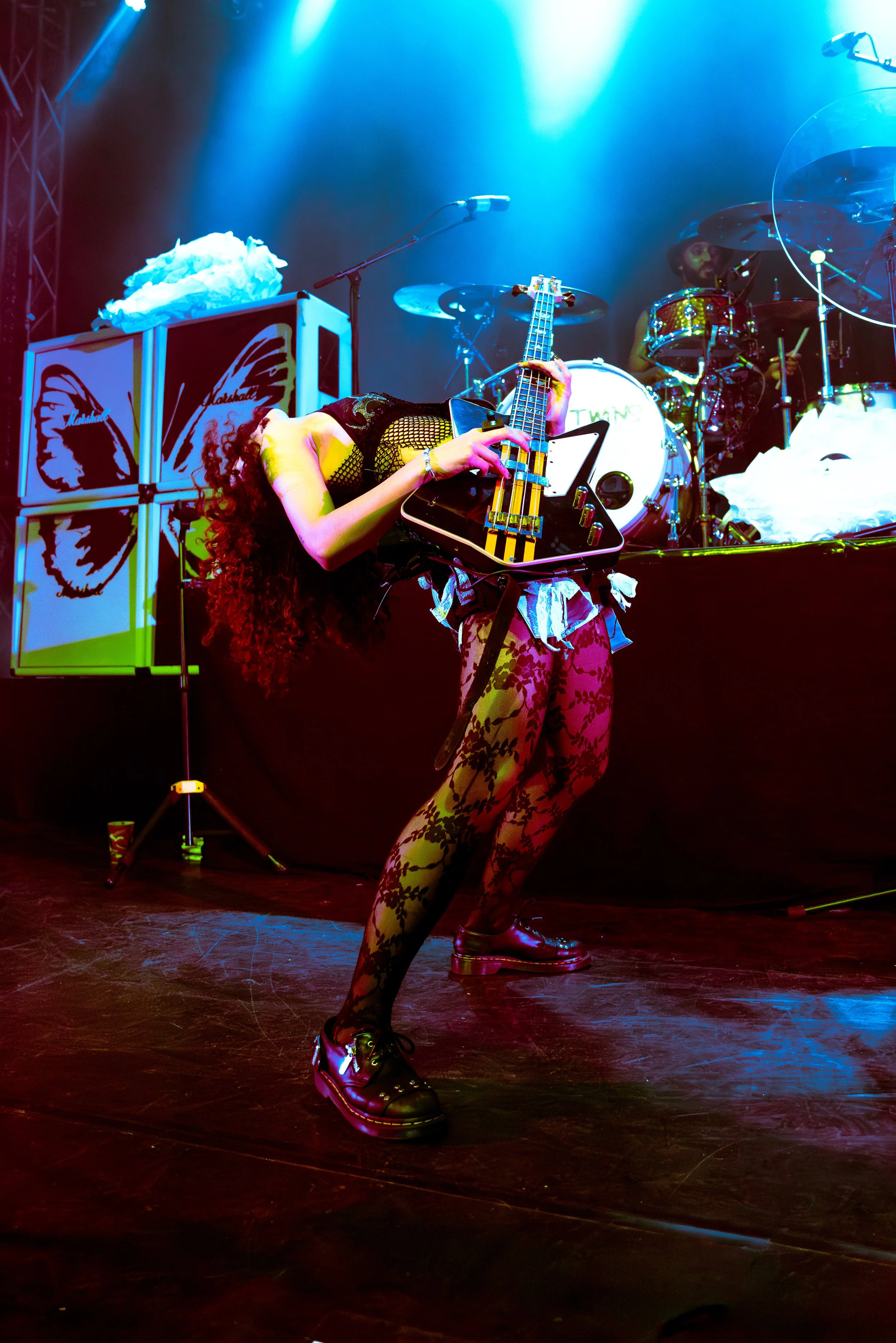 Bassist Georgia South contributed to the spirited performance not just by providing the bass-heavy sound but also by jumping all over the stage. The duo's sound is known for South’s talent on bass but also their electronic additions which seem to come from the 20+ pedals both her and Love have set up in front of them. It made sense that the only rule I got as a photographer was not to take any detailed pedalboard shots. You can tell their talent and high musical intelligence just by imagining their setup. I’m not actually exaggerating when I say that there had to be at least 20 pedals per band member. Additionally, Georgia South used a wireless effects controller she was wearing on her finger on certain songs. With it, she created synth sounds by moving her hand to and away from the bass strings. Nothing you would hear at their live shows comes from a track, which is astounding and worth any standing ovation. It is incredible how much these two performers seem to move and dance while being able to control every single sound and note of their set.