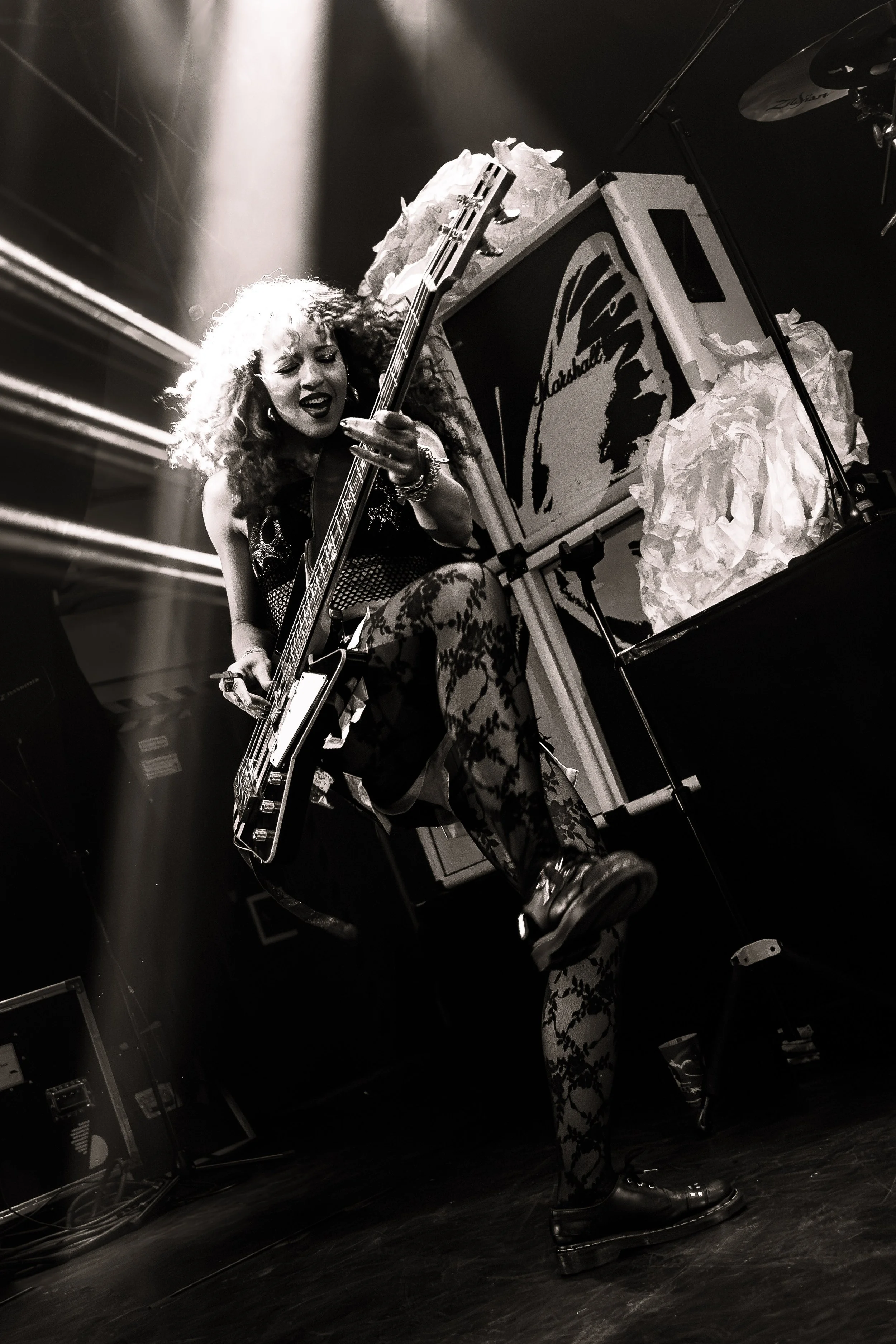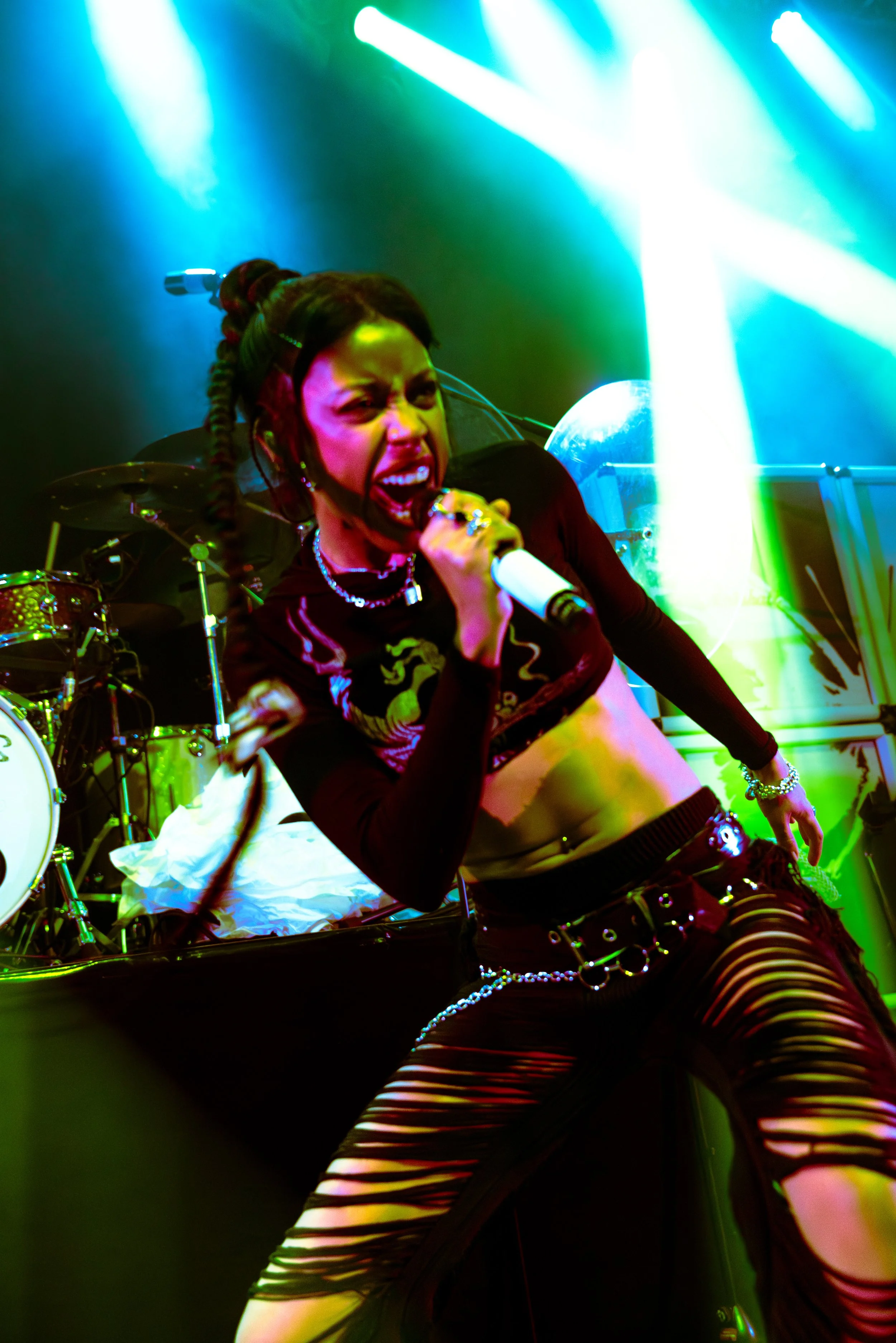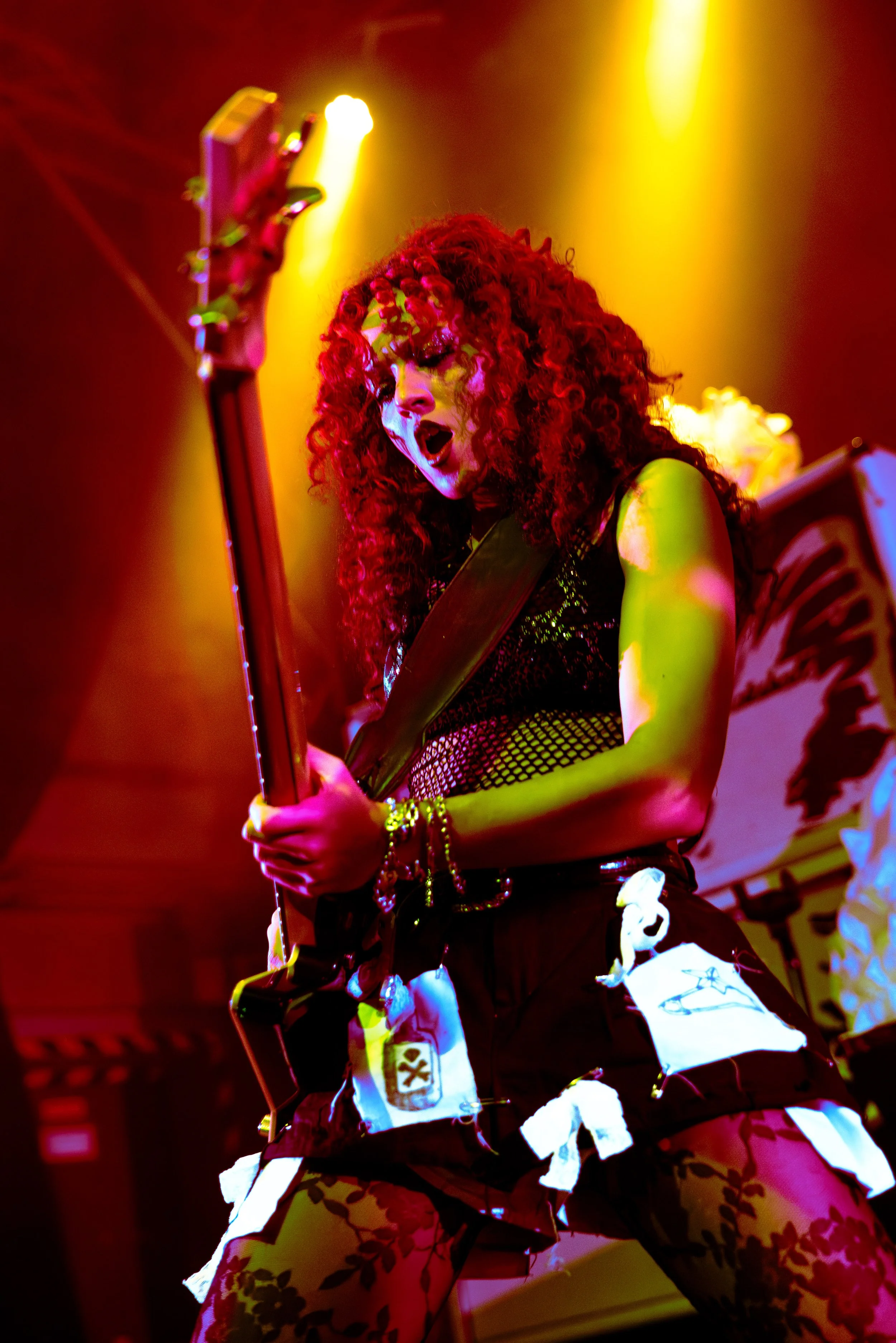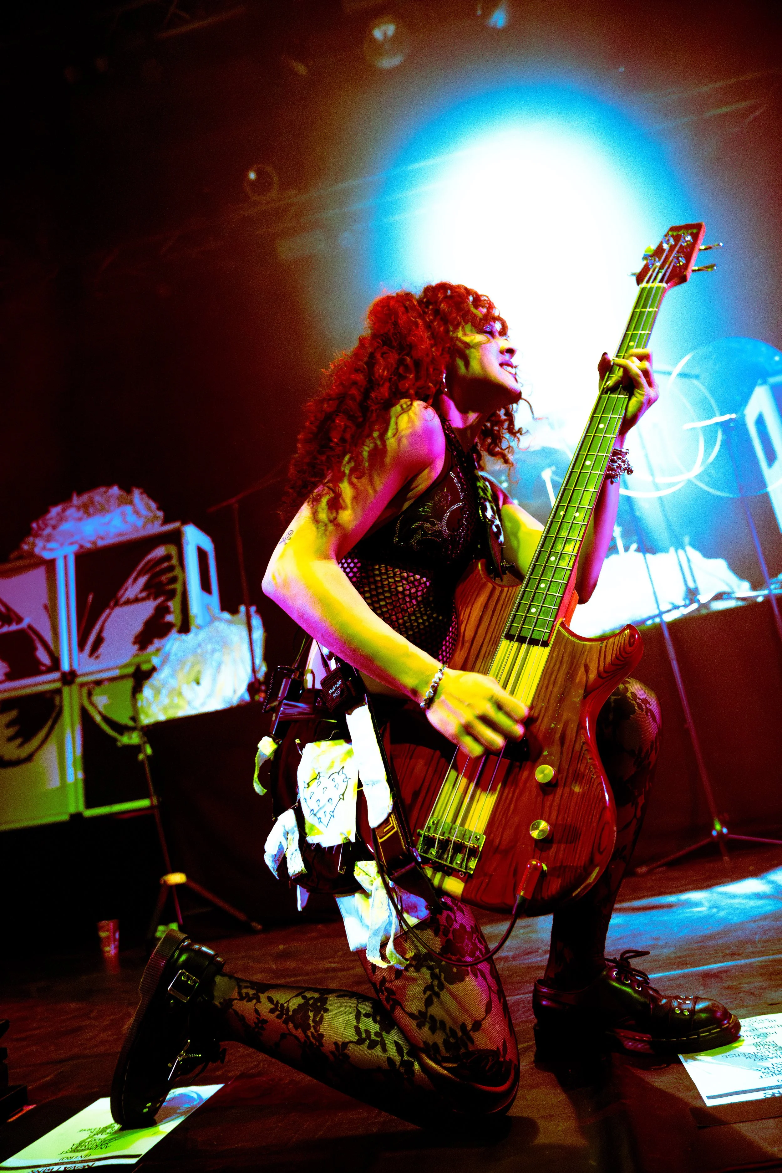 Bassist Georgia South contributed to the spirited performance not just by providing the bass-heavy sound but also by jumping all over the stage. The duo's sound is known for South’s talent on bass but also their electronic additions which seem to come from the 20+ pedals both her and Love have set up in front of them. It made sense that the only rule I got as a photographer was not to take any detailed pedalboard shots. You can tell their talent and high musical intelligence just by imagining their setup. I’m not actually exaggerating when I say that there had to be at least 20 pedals per band member. Additionally, Georgia South used a wireless effects controller she was wearing on her finger on certain songs. With it, she created synth sounds by moving her hand to and away from the bass strings. Nothing you would hear at their live shows comes from a track, which is astounding and worth any standing ovation. It is incredible how much these two performers seem to move and dance while being able to control every single sound and note of their set.