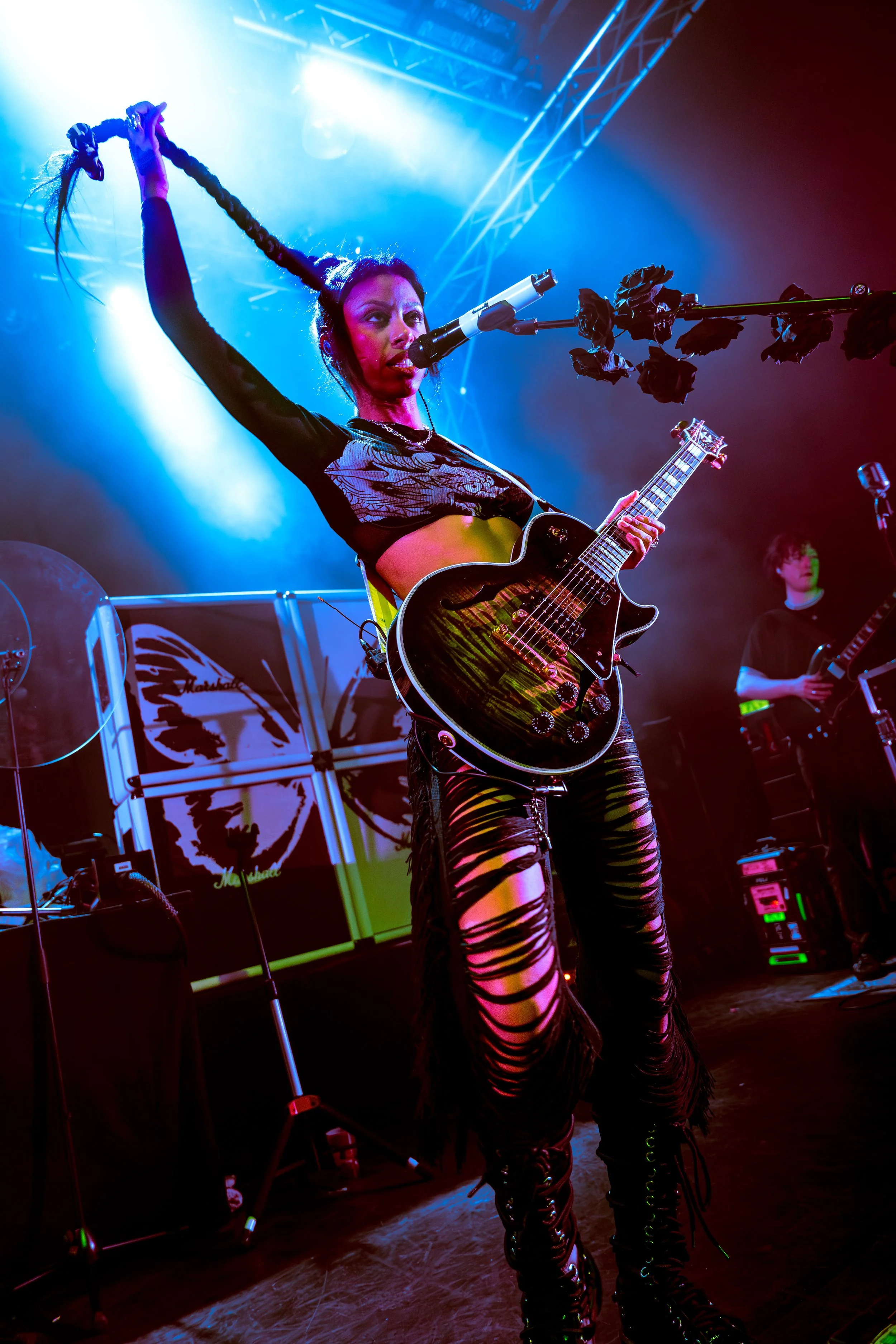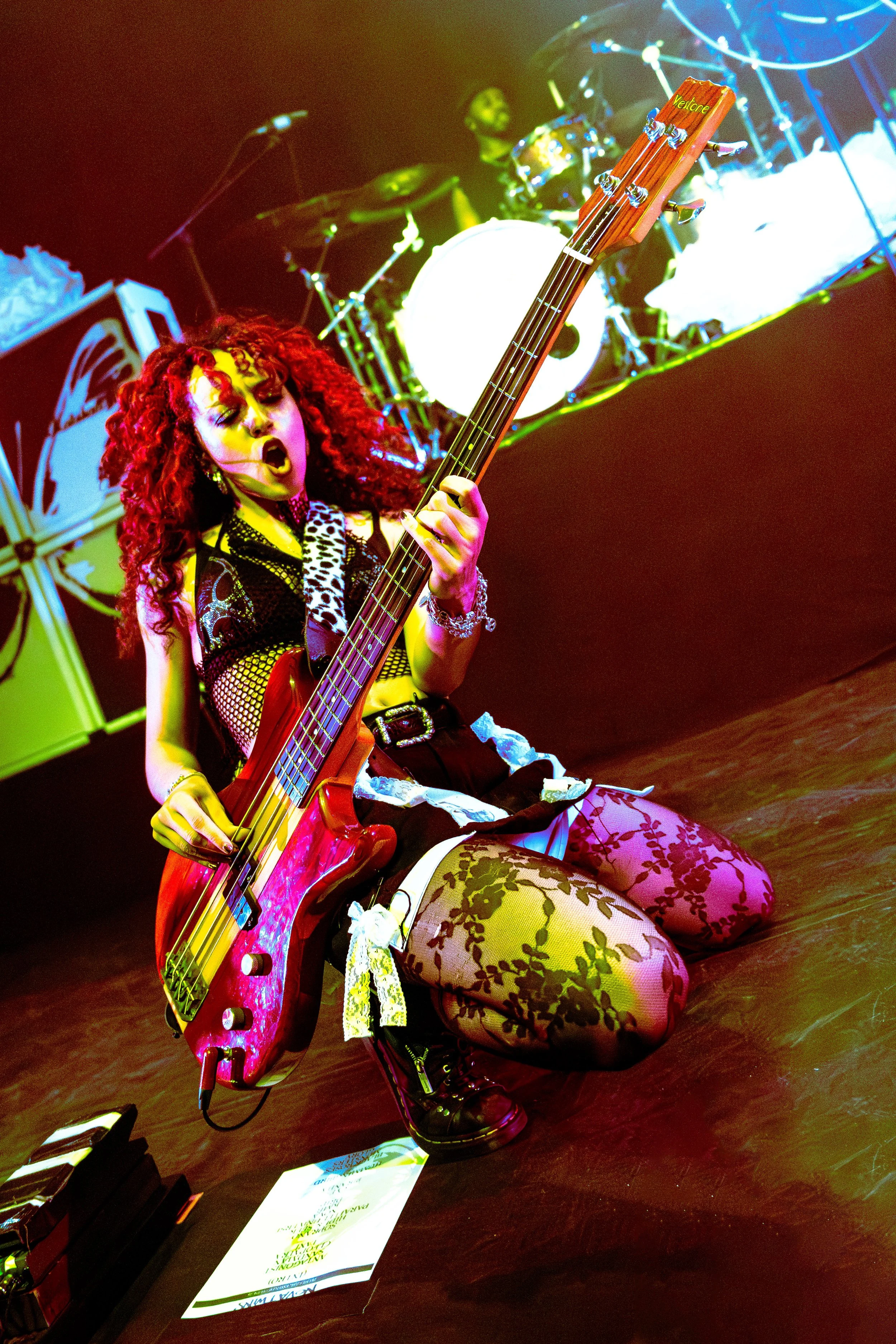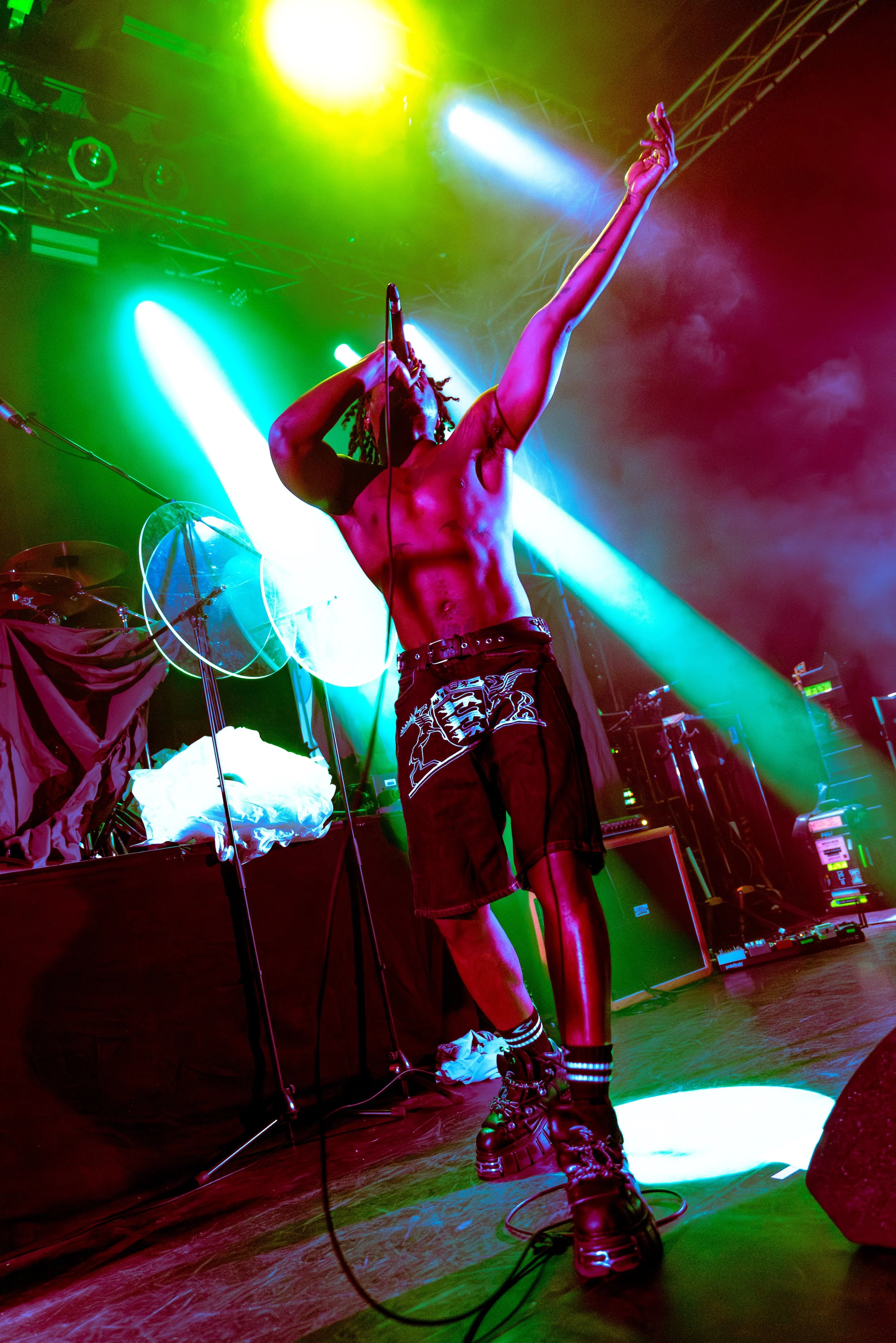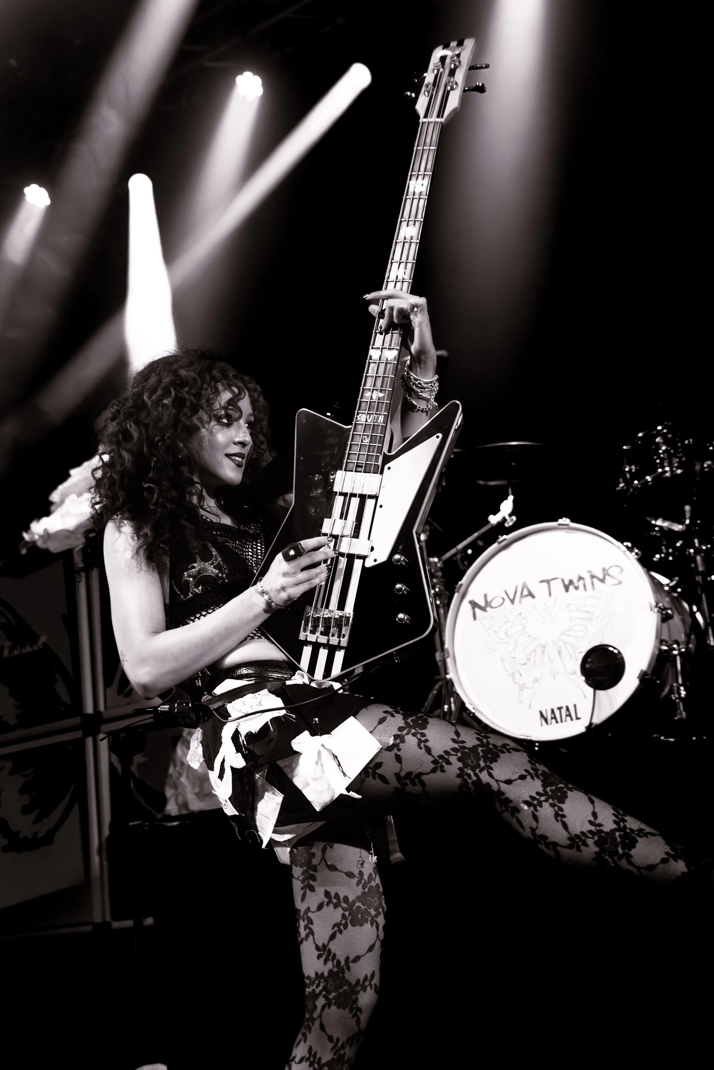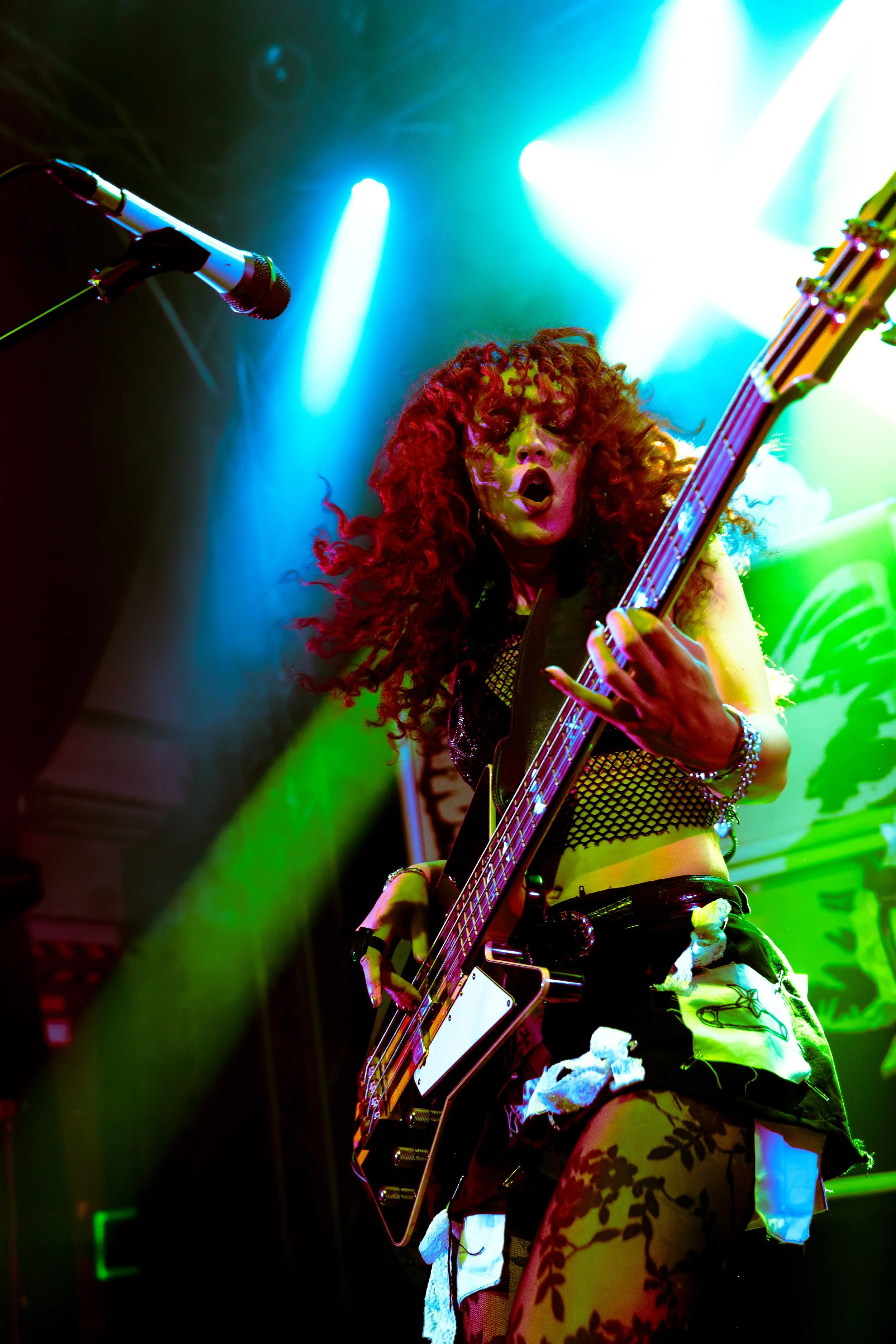 Bassist Georgia South contributed to the spirited performance not just by providing the bass-heavy sound but also by jumping all over the stage. The duo's sound is known for South’s talent on bass but also their electronic additions which seem to come from the 20+ pedals both her and Love have set up in front of them. It made sense that the only rule I got as a photographer was not to take any detailed pedalboard shots. You can tell their talent and high musical intelligence just by imagining their setup. I’m not actually exaggerating when I say that there had to be at least 20 pedals per band member. Additionally, Georgia South used a wireless effects controller she was wearing on her finger on certain songs. With it, she created synth sounds by moving her hand to and away from the bass strings. Nothing you would hear at their live shows comes from a track, which is astounding and worth any standing ovation. It is incredible how much these two performers seem to move and dance while being able to control every single sound and note of their set.