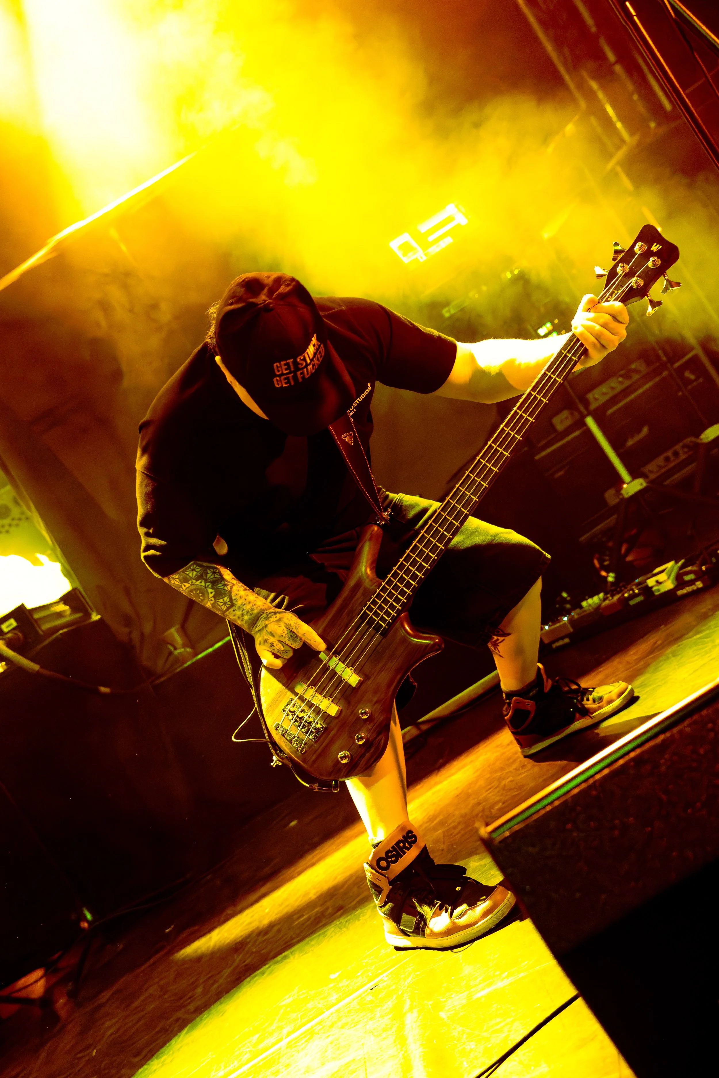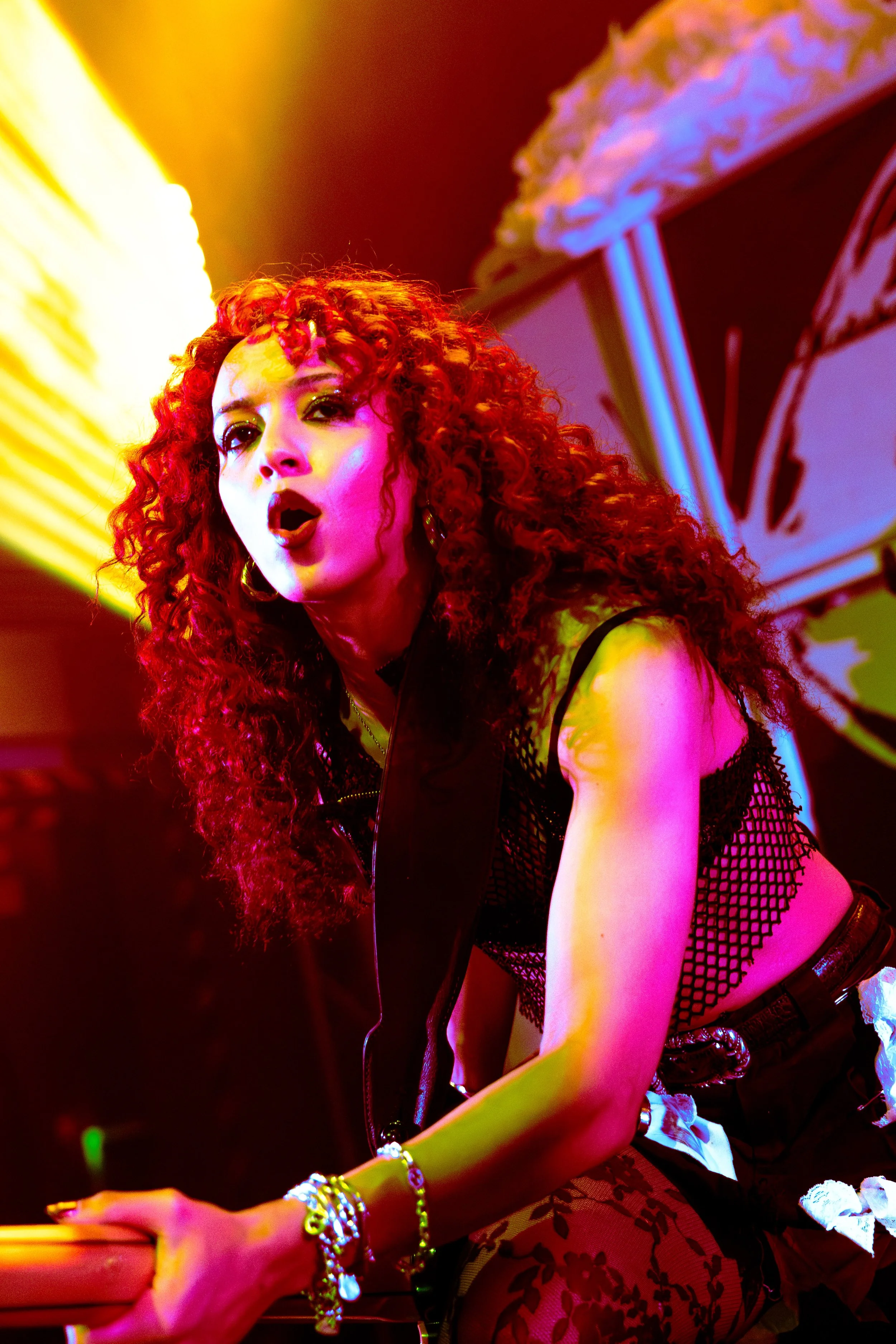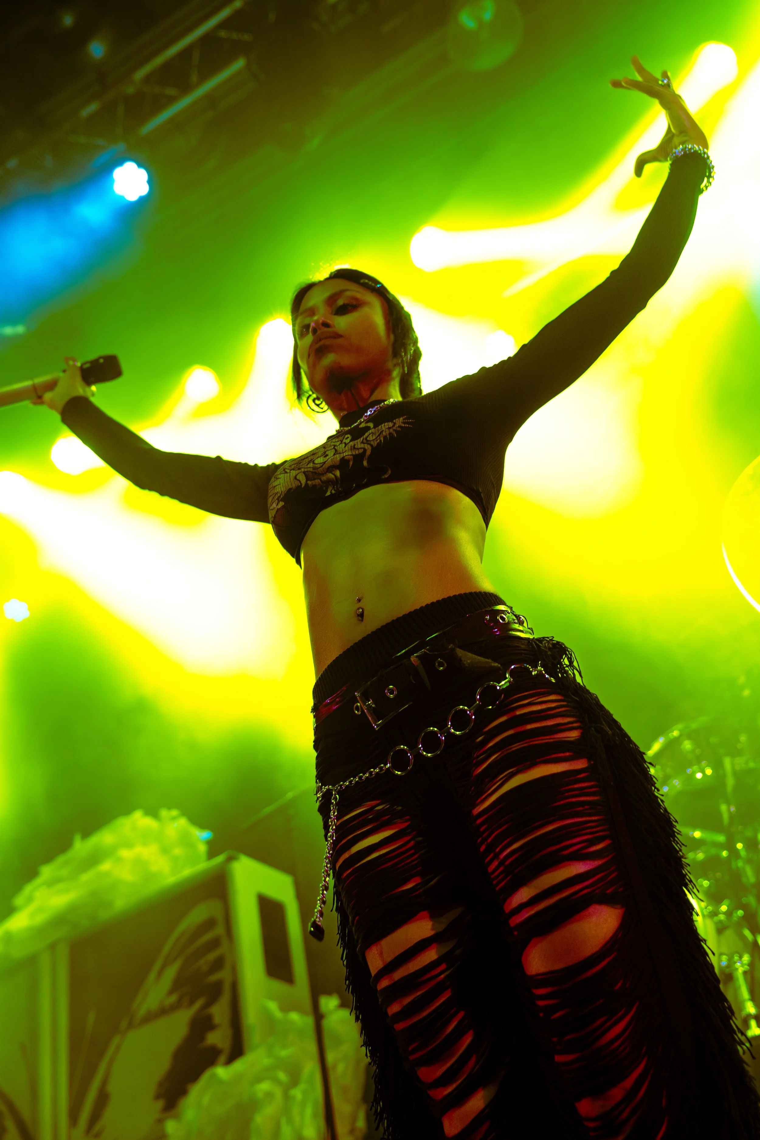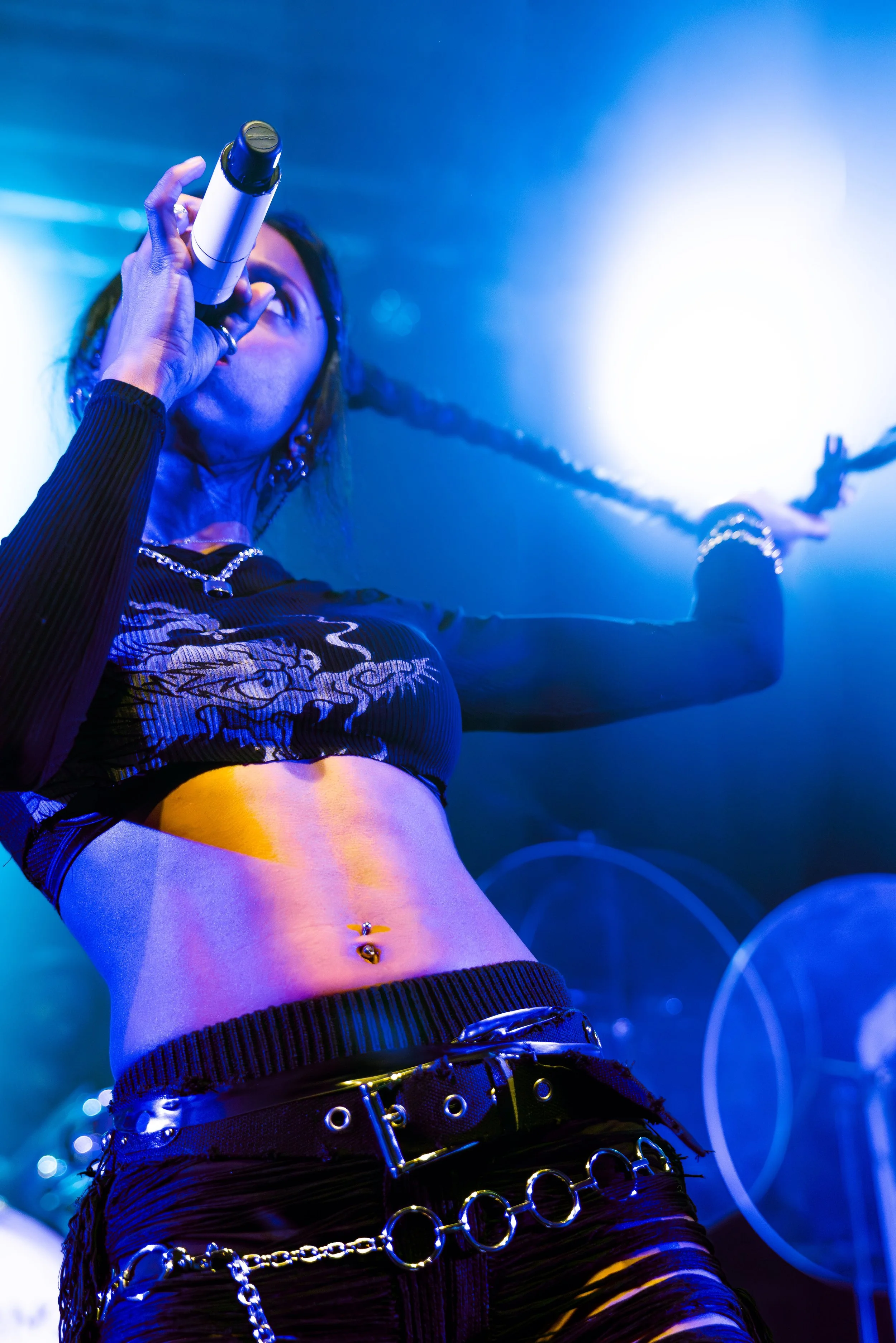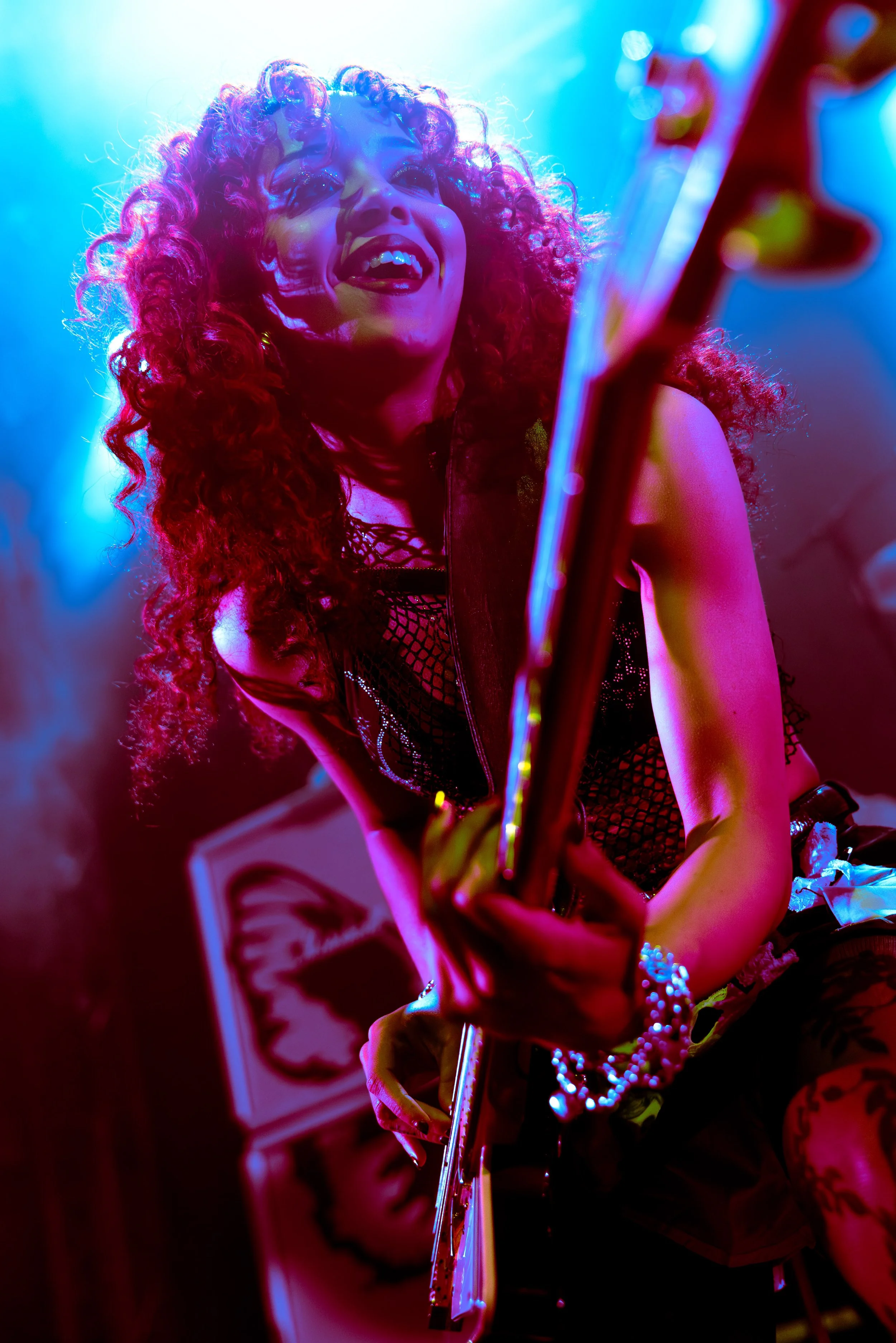 Bassist Georgia South contributed to the spirited performance not just by providing the bass-heavy sound but also by jumping all over the stage. The duo's sound is known for South’s talent on bass but also their electronic additions which seem to come from the 20+ pedals both her and Love have set up in front of them. It made sense that the only rule I got as a photographer was not to take any detailed pedalboard shots. You can tell their talent and high musical intelligence just by imagining their setup. I’m not actually exaggerating when I say that there had to be at least 20 pedals per band member. Additionally, Georgia South used a wireless effects controller she was wearing on her finger on certain songs. With it, she created synth sounds by moving her hand to and away from the bass strings. Nothing you would hear at their live shows comes from a track, which is astounding and worth any standing ovation. It is incredible how much these two performers seem to move and dance while being able to control every single sound and note of their set.