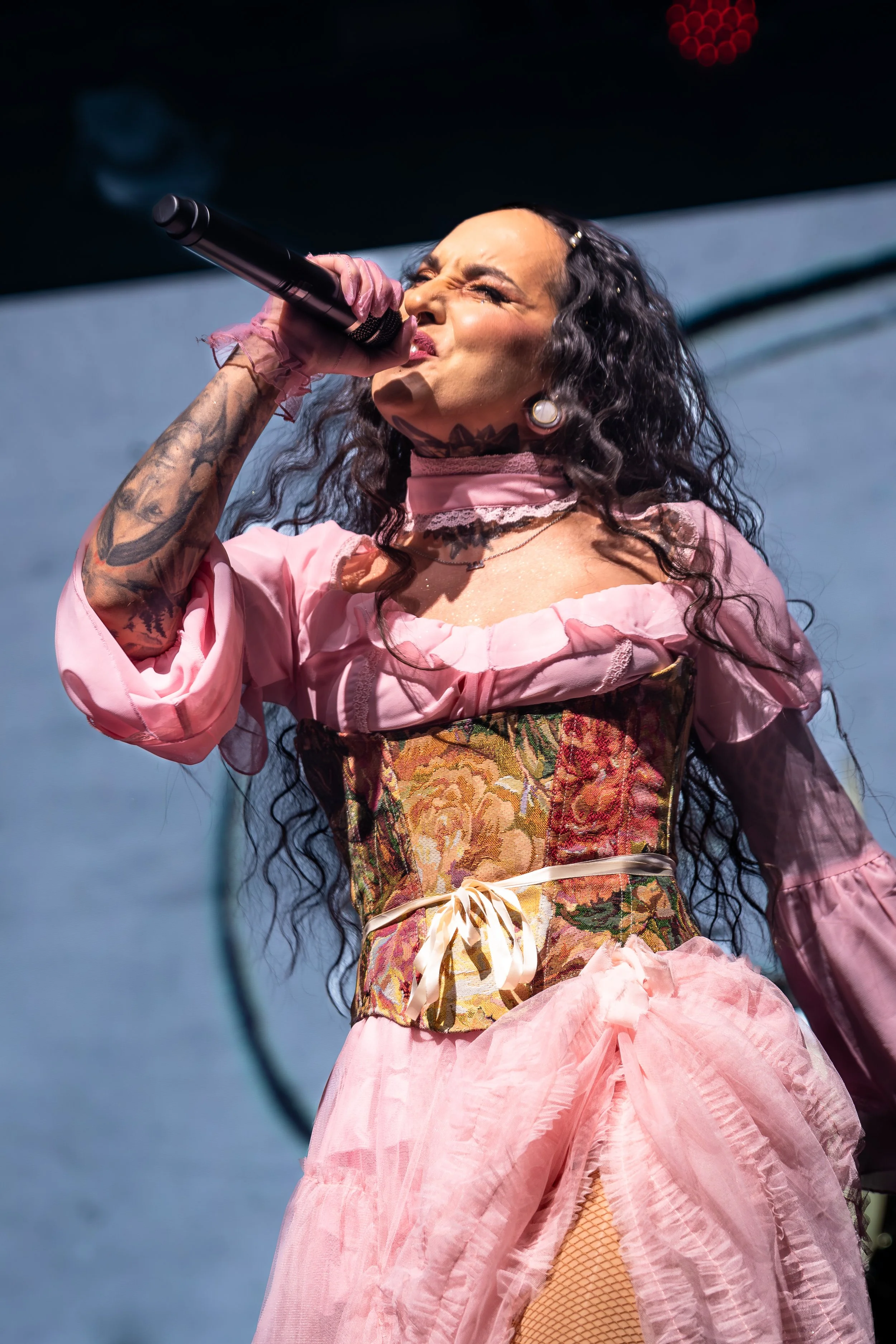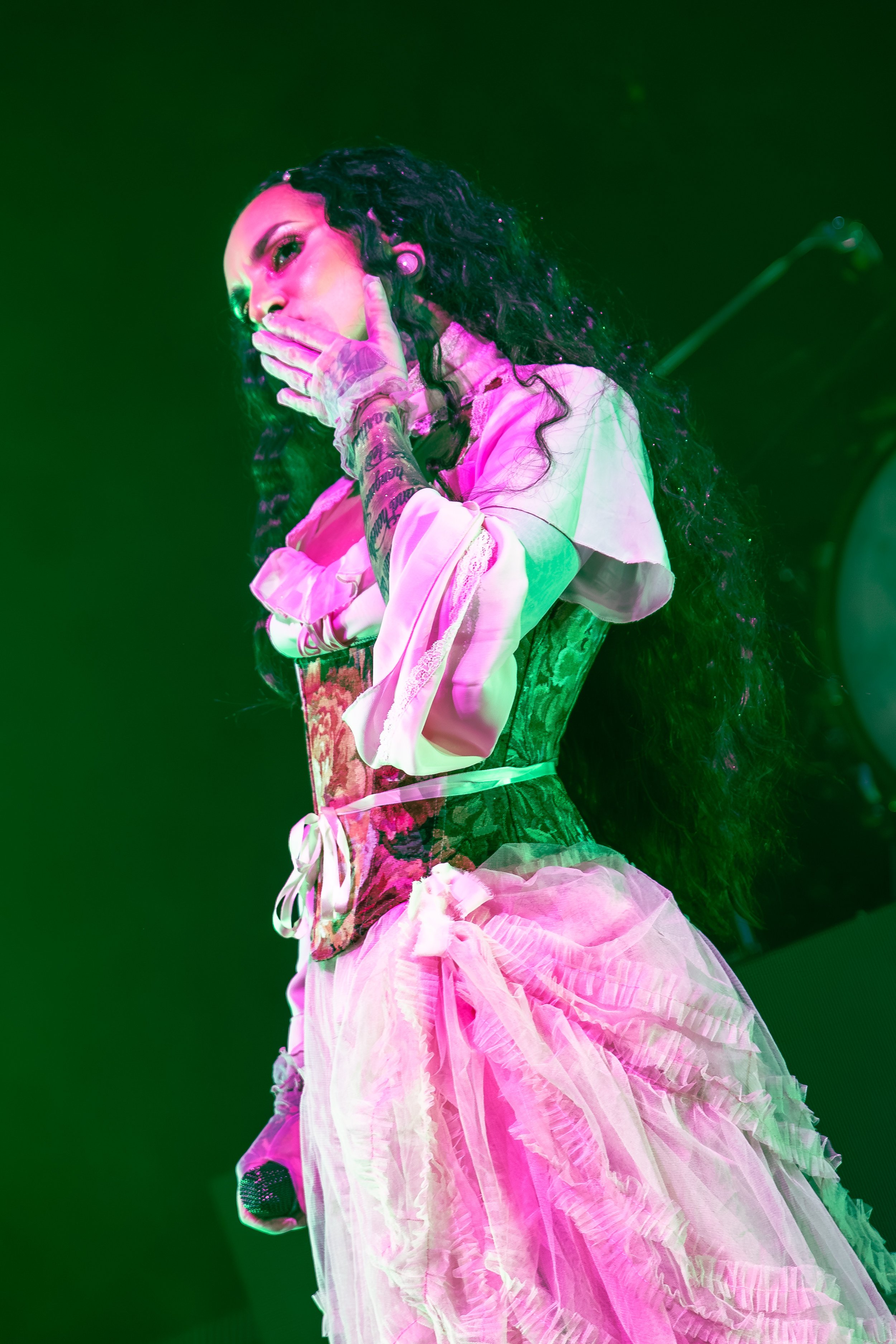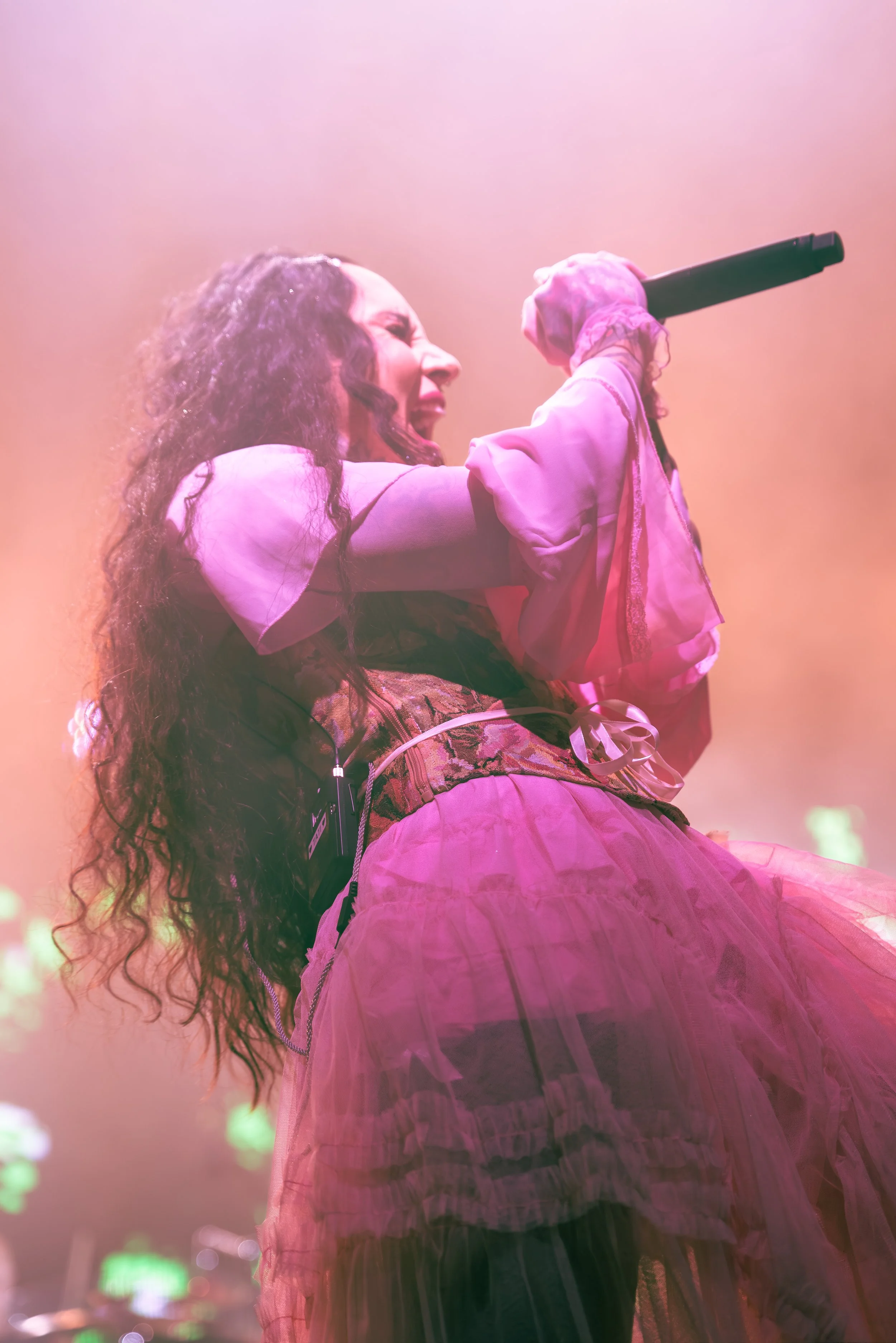 As opposed to what the sound and genre suggest, Jinjer’s singer Tatiana Shmayluk appeared in a flowy pink dress with serious ruffles, matching pink gloves and neck scarf, as well as a flower-print corset. With glitter on skin and hair, she could've embodied an — albeit tattooed — elven princess. A beautiful apparition, as my mother said, when I first showed her one of my photos. And yet, one with an incredible vocal range, that lets the unknowing search for where that voice is coming from, before landing back on the lady up front.